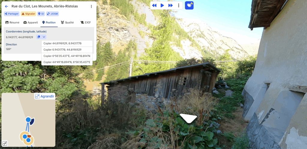 Dans Panoramax, repérer le cliché désiré. Dans le cas présent, c’est le bout d’un chemin rural. Le cliché dans Panoramax est orienté autrement, comme la photo est prise en 360°, il a suffi de la tourner sur elle-même avant de copier les coordonnées en haut à gauche, en cliquant sur « Position » :
