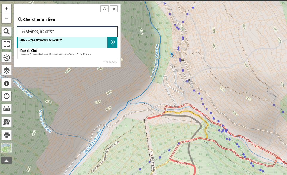 Dans uMap, cliquer sur l’outil de recherche en barre de gauche (la loupe), puis coller la position, et enfin cliquer sur le picto pointeur. Le pointeur va s’ajouter à l’endroit où la photo a été prise.