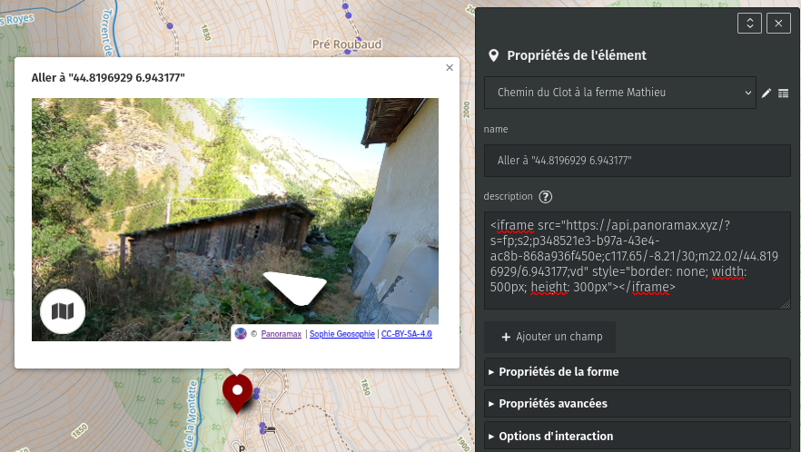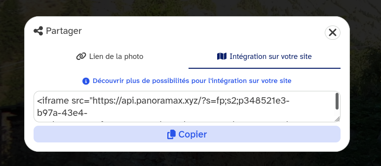 Dans Panoramax, déplier le cadre d’information en haut à gauche, sélectionner “Partager”, puis “Intégration sur votre site” et copier l’Iframe