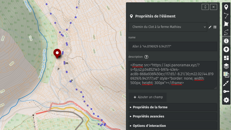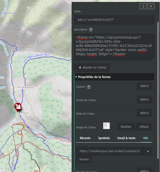 La coller dans uMap, dans le cadre « Description » du pointeur en barre de droite. Pour accéder à ce cadre de réglage, clic droit su rle pointeur et clic sur le stylo :